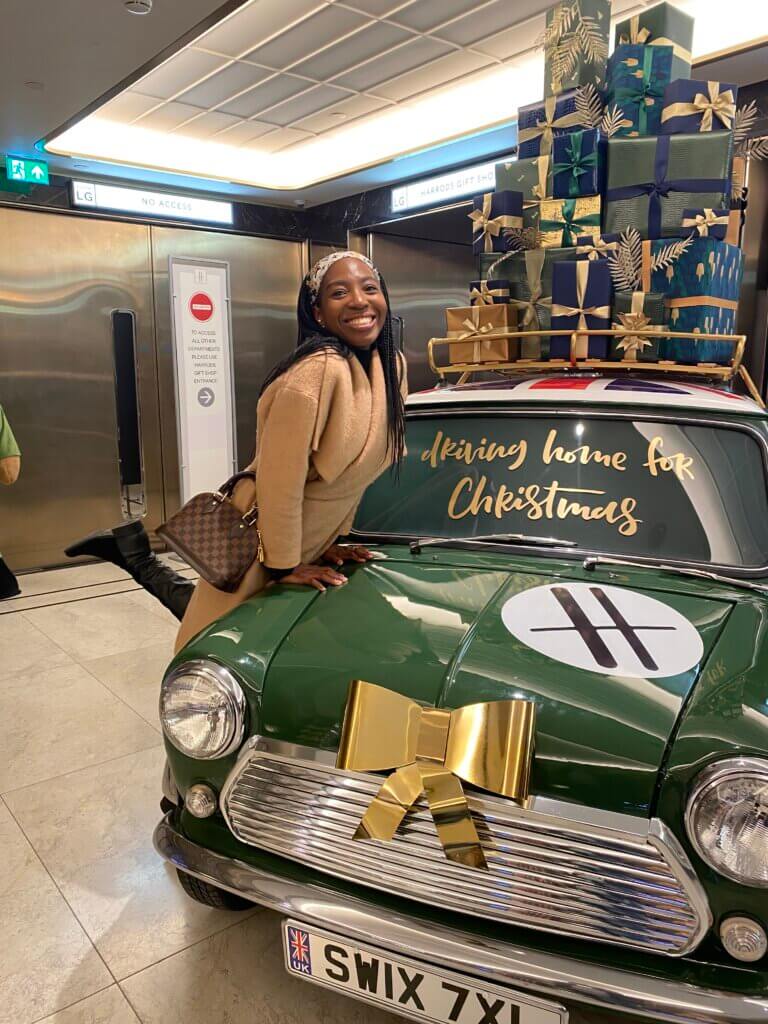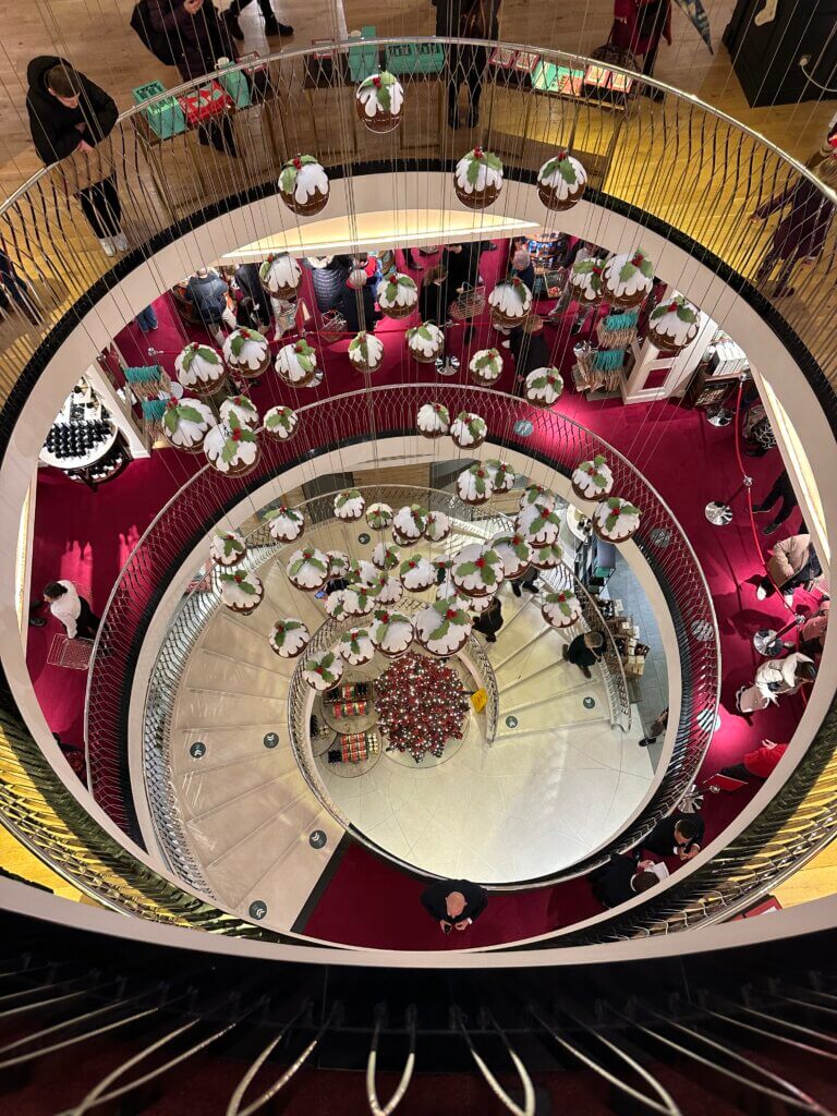 Fortnum and Mason is one of those quintessentially British heritage shops. It was said to be Queen Elizabeth’s favourite shop and it is one of the shops that holds a Royal license. Fortnum and Mason at Christmas is wonderful. From the street, you can see the giant lit up year which changes every year and the shop usually has a theme. While this is common with most London shops, what makes F&M different is stepping inside. There you will find a full-on Christmas shopping experience and one of the best displays. My favourite installation so far was in 2024, when there were giant puddings casually swinging. My toddler was convinced that the shop was Santa’s workshop LOL – I believed her tbh.